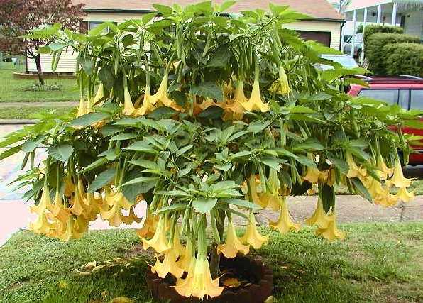 曼陀罗又叫曼荼罗、满达、曼扎、曼达、醉心花、狗核桃、洋金花、枫茄花、万桃花、闹羊花、大喇叭花、山茄子。草本或半灌木状,高0.5~1.5米,全体近于平滑或在幼嫩部分被短柔毛。常生于荒地、旱地、宅旁、向阳山坡、林缘、草地。喜温暖、向阳及排水良好的砂质壤土,具有药用或观赏而栽培。