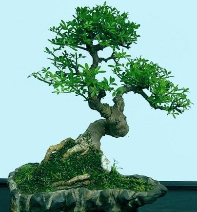 若能配假山和微型水潭,则盆景可自成一番天地;一枝凸出而有独叶,可让人陶醉和流连。