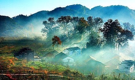 石城村在婺源县西北的古坦乡境内,村头有石壁,岩如古城,城“墙”内外有高度35米以上的枫树,远远超过屋顶,和巨大而且笔直向上的树冠相比,黑瓦白墙简直就是玩具屋子。清晨雾气或炊烟中的火红枫树简直就美得不像人间景致。