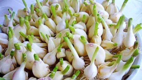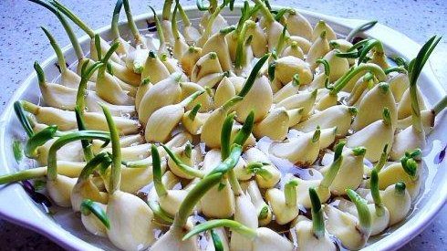 大蒜发芽以后并不是我们平时所购买的大蒜苗,大蒜只要是放置在干燥的空气中,或者将大蒜放在水中,不出几日,大蒜就可以发芽。这是因为大蒜在收获以后,有2个月左右的休眠期。休眠期一旦过去,大蒜就会迅速地发芽长叶,并消耗茎中的营养物质。