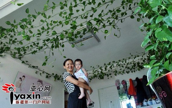敲响通嘉世纪城4号楼2单元502室的房门,开门的瞬间只能感叹:“看看人家这花种的”,密密仄仄的绿叶爬满了房顶,间或有几根藤蔓带着零星的几片叶子耷拉下来,阳光透过窗户条条缕缕地洒进屋。“朋友们都说我就像住在原始森林。”提起自家客厅,李雯有点自豪地说。 李雯家客厅里的绿色植物是绿萝,是她2009年结婚时和丈夫从花卉市场买来的,“买来时是手掌大的两盆,现在都长满了整个客厅,最长的一根都有二十米了”。