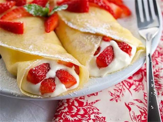 低筋粉、鸡蛋、牛奶、黄油、淡奶油、盐、草莓果酱、沙拉酱、新鲜草莓