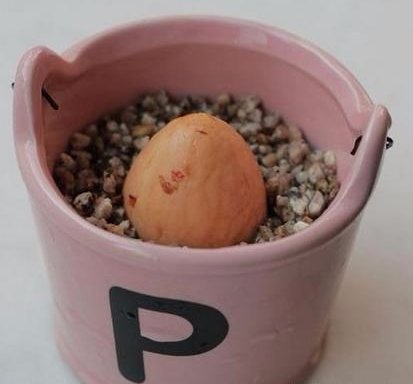 3、果核尖头朝上种花盆里,记得要露出1/3,加水保持湿润