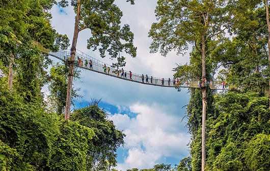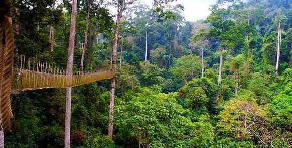 在繁茂的原始热带森林里,密密麻麻都是望天树,百米参天,一条蜿蜒数百米的走廊凌空其中。