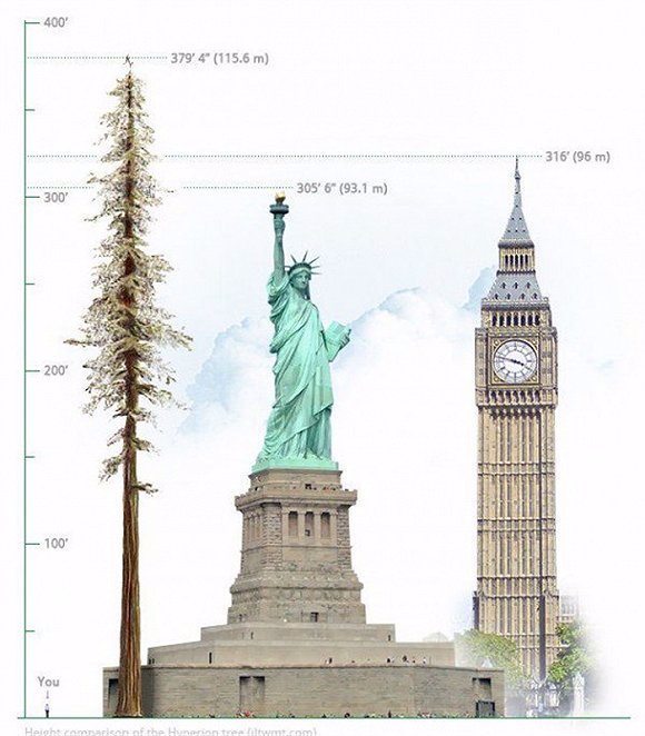 这是加州的一棵高达369英尺(约112.5米)的红杉树,人称“同温层巨人”(Stratosphere Giant),位于美国加州洪堡红杉州立公园(Humboldt Redwoods State Park)内。为了让你对它的高度有个清楚的概念,我们可以这样换算:这个高度相当于美国自由女神像的两倍。