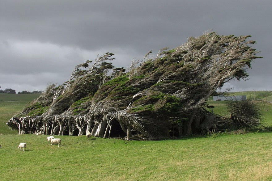 新西兰一处风吹树斜奇景:刚好生长在新西兰南端的边坡上,不断受到大风劲吹,却又能坚持生长。