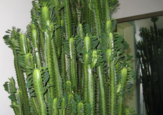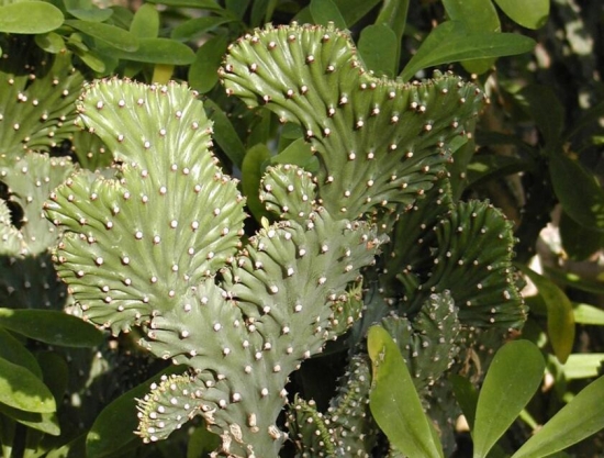麒麟掌,原产印度东部干旱、炎热、阳光充足的地区,为霸王鞭的带化变种。具棱的肉质茎变态成鸡冠状或扁平扇形,其他同霸王鞭。