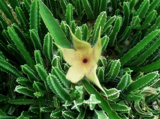 它秋季开花,花大,五裂张开,星形,极象海星,淡黄色,具淡黑紫色横斑纹,边缘密生长细毛,具臭味。其传宗接代以恶臭引诱苍蝇授粉,故又名臭肉花。 花期7~8月。