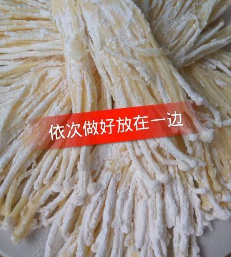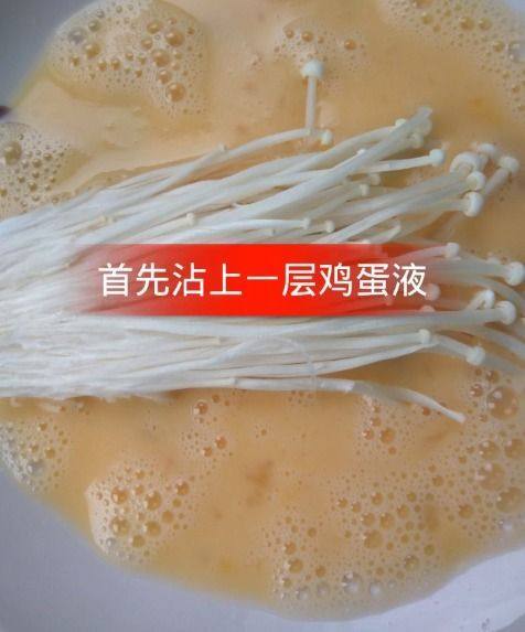 接下来,在把裹着鸡蛋液的金针菇放到淀粉中