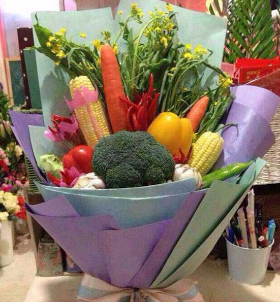 “蔬菜花束”是2012年2月14日情人节突然出现的情人节另类创意礼物,它是用西兰花、胡萝卜、辣椒等蔬菜插制绑扎而成的花束。色彩丰富、花样各式,可自由发挥创造,跟真实的花束造型相似。