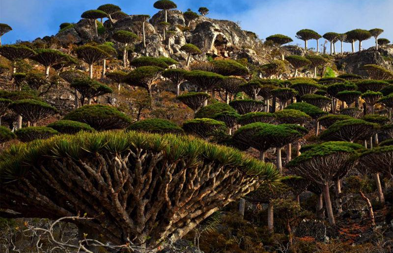 龙血树和沙漠玫瑰是索科特拉岛中很独特的植物,龙血树树冠茂密像倒转的雨伞,可以提供足够的树荫来减少蒸发,也可以保护树荫下的种子,所以它们一般生长得茂密。