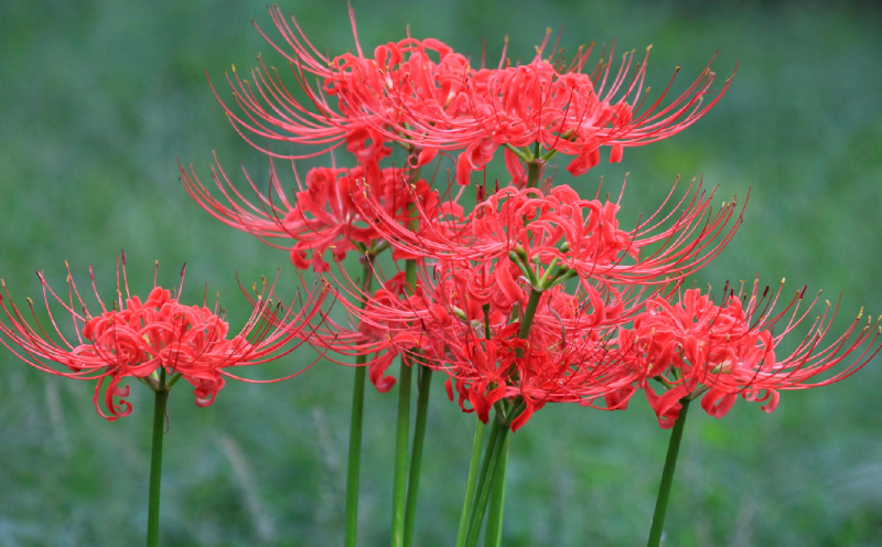 传说,彼岸花是自愿投入地狱的花朵,被众魔遣回,但仍徘徊于黄泉路上,众魔不忍,遂同意让她开在此路上,给离开人界的亡魂们一个指引与安慰。所以,认为彼岸花是生长在忘川河边的接引之花,是冥界唯一的花。在那儿大批大批的开着这花,远远看上去就像是血所铺成的地毯,又因其红的似火而被喻为“火照之路”。
